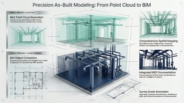 Instead of delivering only 2D CAD drawings, professionals now generate intelligent BIM models (typically in Revit), where: