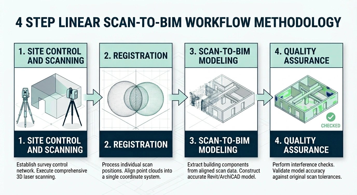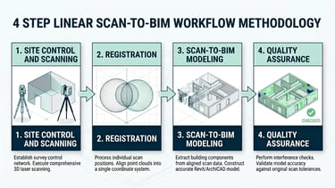 Scan-to-BIM is the process of converting 3D laser scan data into a digital Building Information Model (BIM). The model is created in software such as Revit and used for design, coordination, and documentation.