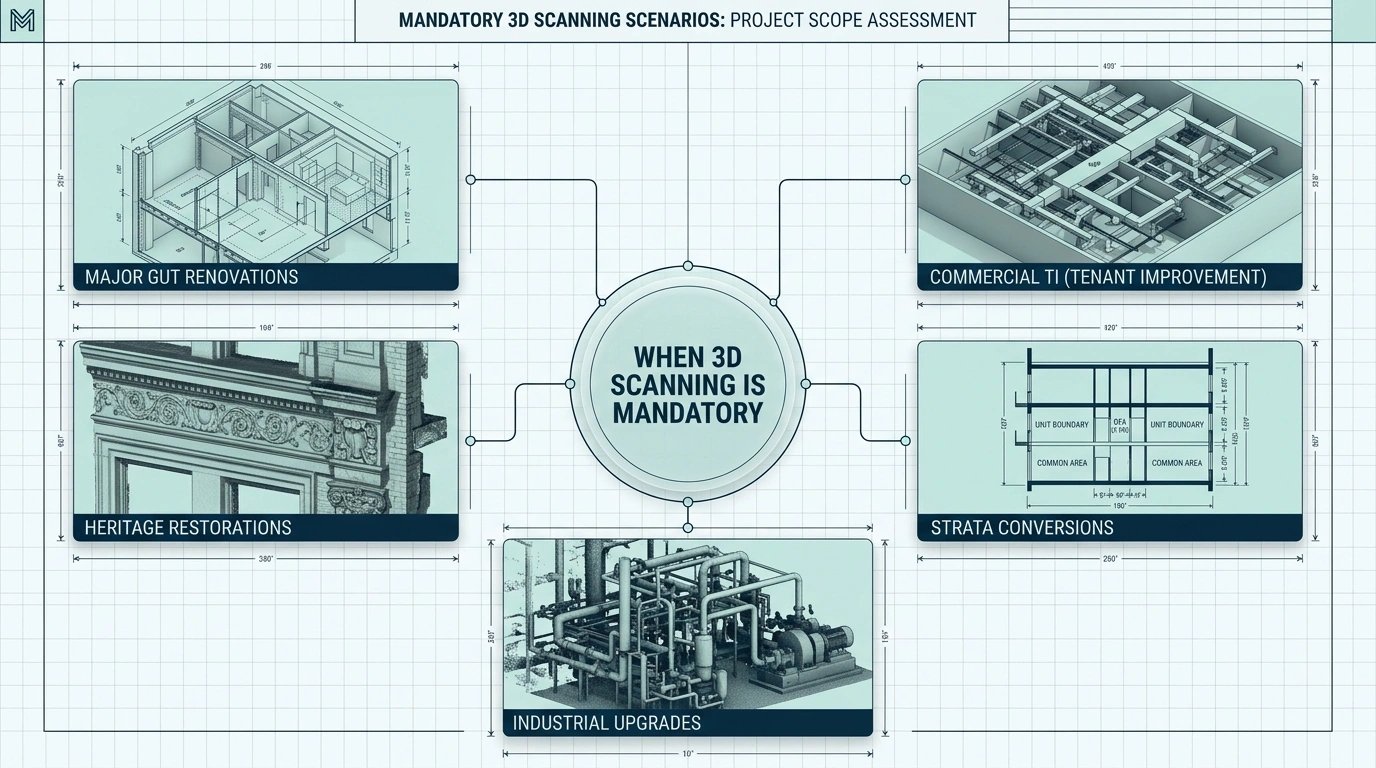 Larger projects such as commercial buildings or industrial facilities may require detailed scanning and BIM modeling, which increases project scope.