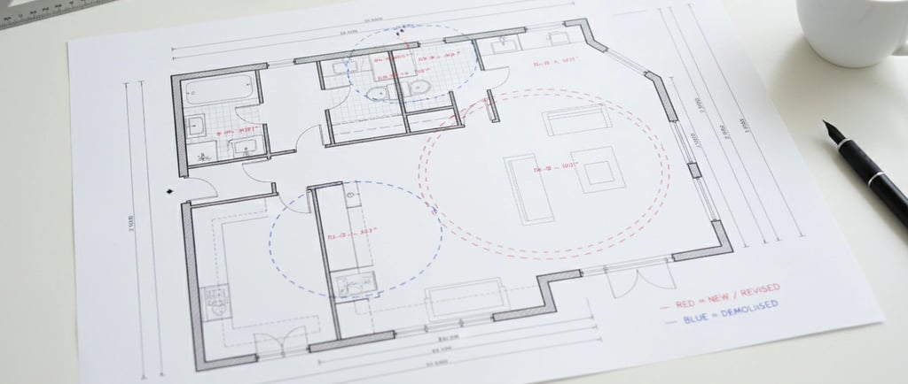 Contractor markups (red-line drawings): these are informal notes or sketches added to the original plans by the contractor during construction, often in red ink, showing on-site changes. While useful internally, markups are typically unverified, lack precise measurement, and should not be relied upon for legal or regulatory purposes. A contractor might roughly note that a wall moved 10 inches, but this lacks the necessary precision and context for professional design or compliance reporting.