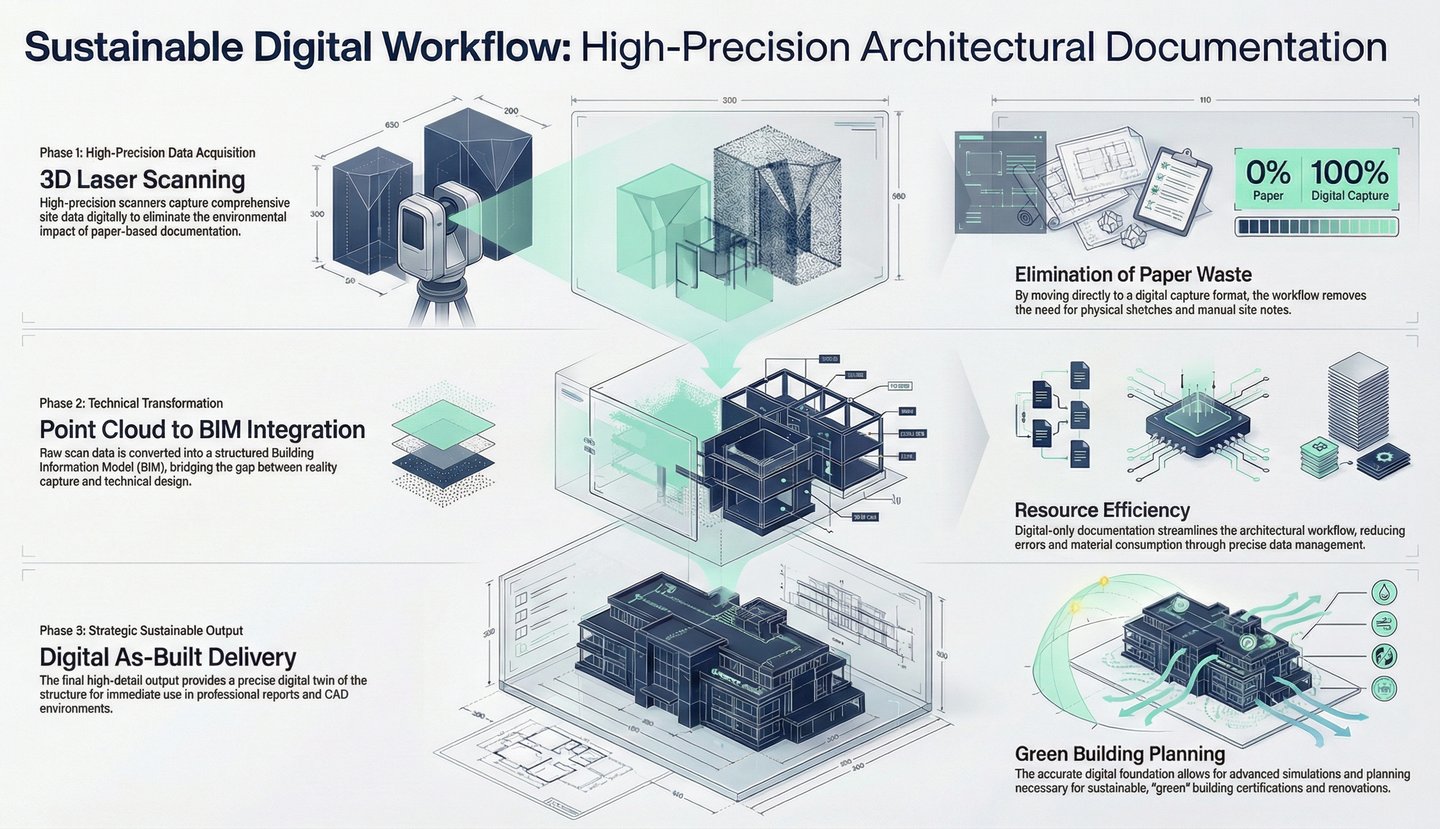 Sustainable surveying is the use of low-impact, digital-first measurement technologies - primarily 3D laser scanning and LiDAR - to document buildings and sites with minimal environmental disruption.