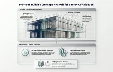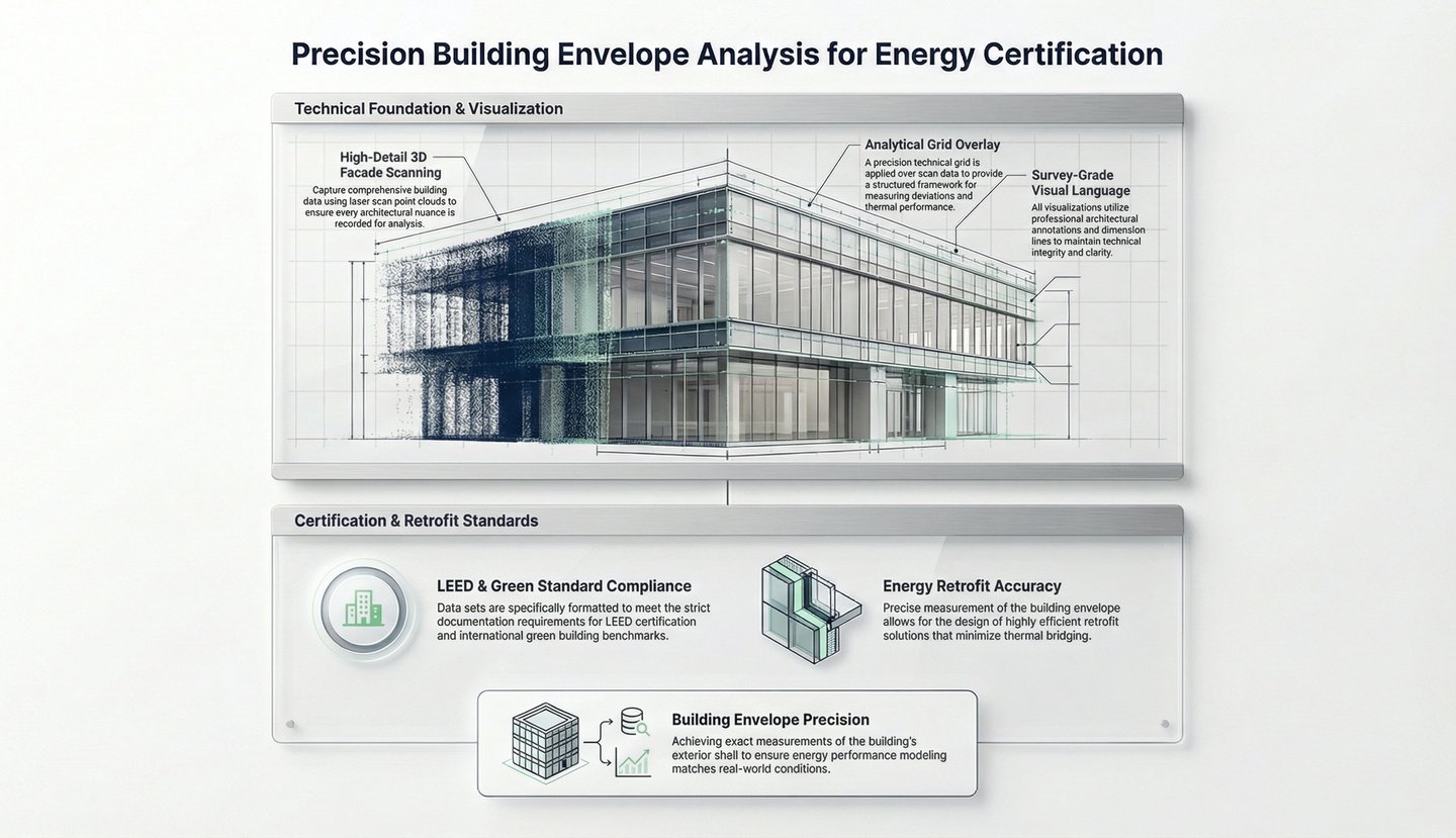 3D laser scanning provides the geometric accuracy required for energy modeling and retrofit planning.